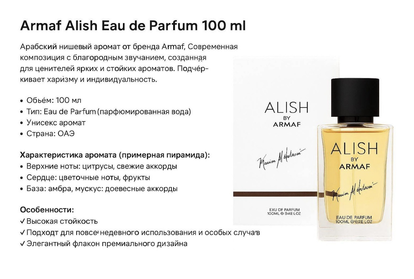 Alish — это аромат, который раскрывается словно утренний луч солнца, скользящий по гладкой поверхности воды. Он создан для тех, кто ценит свежесть, внутреннюю силу и тонкую чувственность.